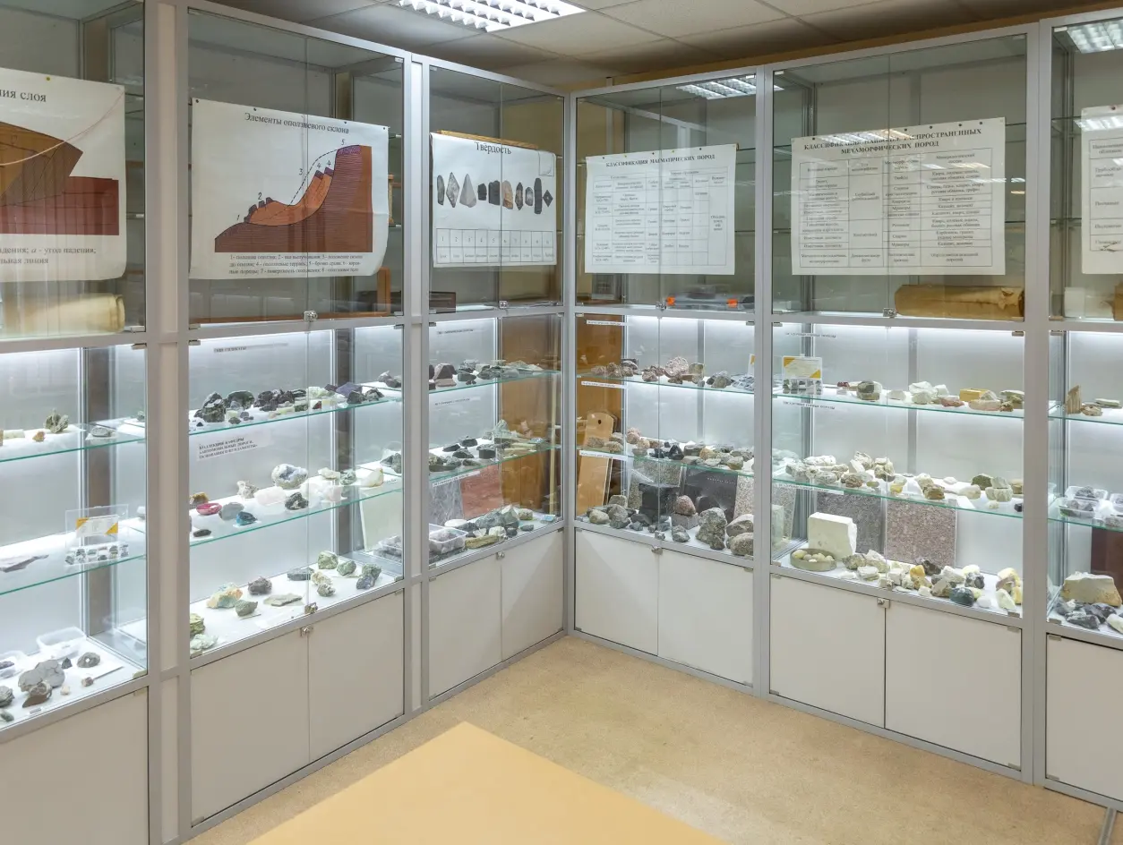 Na Faculdade de Engenharia Civil funciona um gabinete de geologia, onde são apresentadas amostras de minerais e materiais de construção, bem como um espaço para realizar trabalhos de laboratório com os alunos.