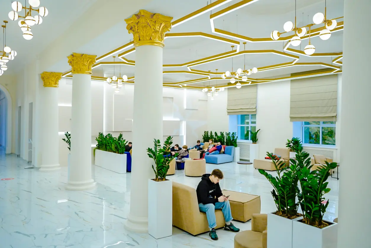 Минтақаҳои муосир барои таҳсил, муошират ва истироҳат. Муҳити бароҳат, ки дар он идеяҳо дар муколама таваллуд мешаванд ва ҳаёти донишгоҳ аз доираи аудиторияҳо мебарояд.