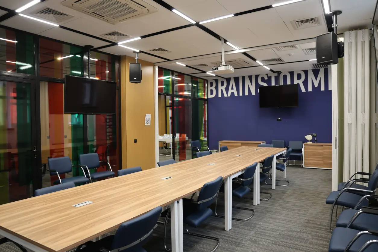 Kovorking-markazi — bu multimedia uskunalari bilan jihozlangan zamonaviy makon bo'lib, amaliy mashg'ulotlarni nostandart formatda o'tkazish imkoniyati mavjud.
